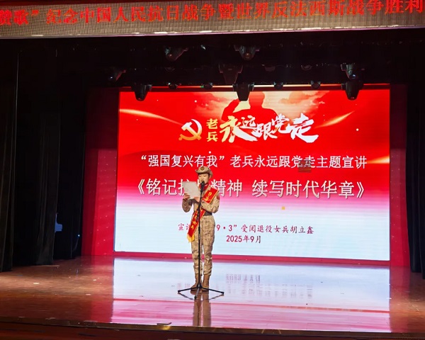 参加纪念中国人民抗日战争暨世界反法西斯战争胜利80周年大会的退役女兵代表胡立鑫以“铭记抗战精神 续写时代华章”为题宣讲。她结合自己的阅兵训练经历,深刻诠释“不怕苦不怕累”的精神内涵,彰显军人的使命担当和责任意识。