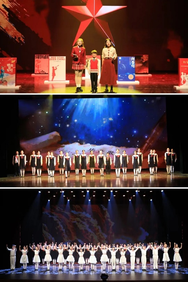 第一篇章“红星闪烁”以《红星照耀中国》等经典书籍为线索,通过情景朗诵《红星闪烁》和歌曲联唱《青春的呐喊》,再现了革命历史的峥嵘岁月与红色血脉的传承。