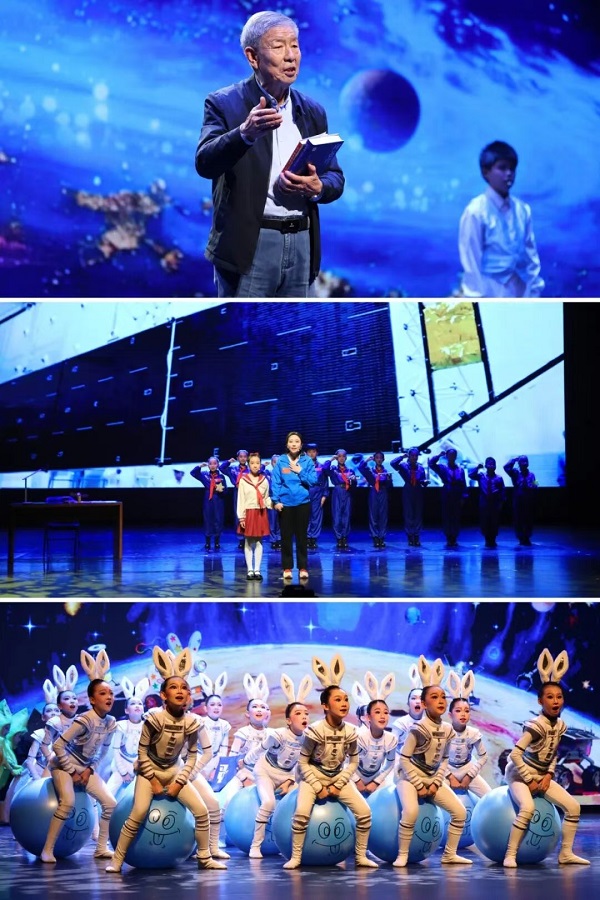 第三篇章“筑梦苍穹”通过“五老”代表金声与青少年共读《北斗牵着我的手》等作品,以及舞蹈《寻兔启事》等节目,展现了中国航天事业的辉煌成就与青少年仰望星空的远大理想。