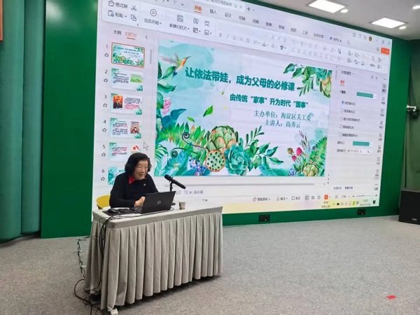 海淀区关工委邀请“五老”代表、海淀法院退休干部尚秀云走进中关村第一小学,作“让依法带娃,成为父母的必修课”专题讲座。