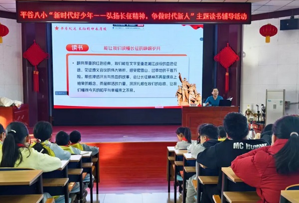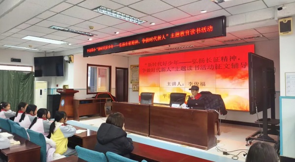 李玉玲结合珍贵视频、详实文献资料及“半条棉被”“金色鱼钩”等经典长征故事,为平谷八小的同学们生动再现二万五千里长征的峥嵘岁月,深入浅出地阐释长征精神的时代内涵,同时紧扣读书与创作核心需求,为同学们提供精准指导,助力大家将红色精神融入征文、演讲作品的构思与撰写,让笔尖与心声共传长征力量。