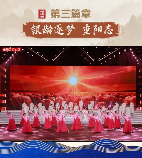 音诗画舞融合表演《山行》诗意描摹出秋日登高、心旷神怡的重阳意境,时代组曲《我们的歌》串联起多首脍炙人口的经典旋律,模特秀《锦绣霓裳》展现了中华传统技艺之美与新时代银龄风采。