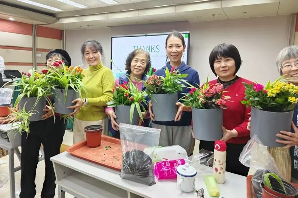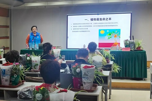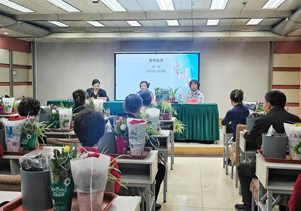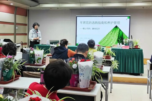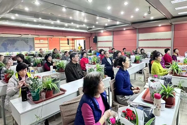 服务团成员郭翎以“植物鉴赏”为题,用影像与故事串联起植物文化、鉴赏要点与配景灵感,带领老同志“足不出户”领略世界各地植物多样奇观。服务团成员王海英聚焦年宵花的养护,围绕光照、温度、浇水、施肥、病虫害防治等关键点逐一讲解,并现场示范换盆、修根、扦插等操作,手把手教学。互动环节,老同志踊跃提问,问题涵盖“阳台朝向与植物选择”“空调房如何保湿”“花后修剪最佳时机”等,两位老师逐一解答,把课堂延伸到家庭。