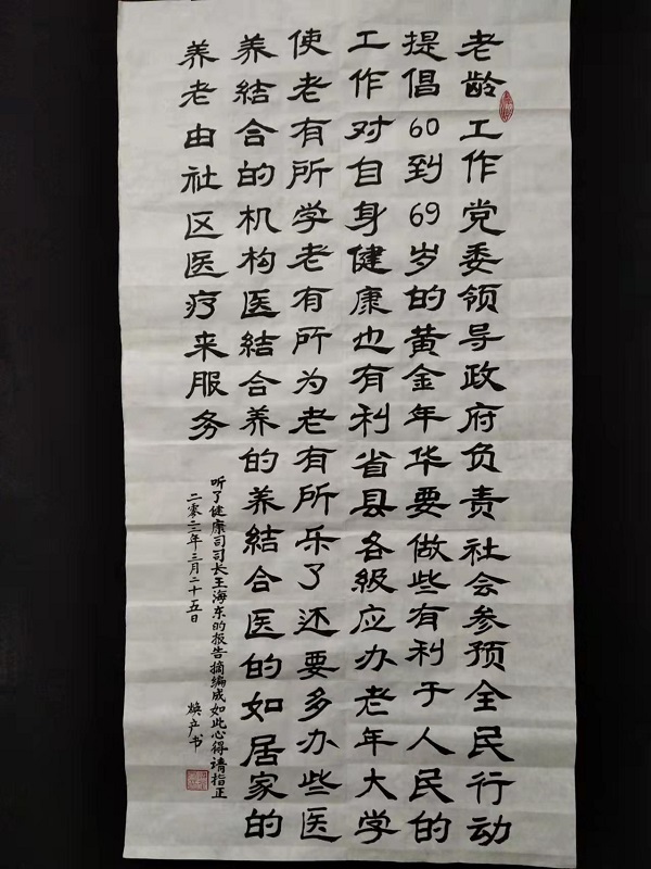 本次活动受到了我校离退休老党员们的积极响应,大家在支部群中分享各自的学习成果,纷纷表示:习近平总书记对老龄工作的重要指示,让人倍感亲切、倍感温暖、倍受鼓舞,感谢党中央高度重视、关爱老年群体。我校95岁高龄的退休老教师包焕产同志听完报告后,还亲自书写了自己学习后的心得体会,充分体现了老有所为,老有所养,老有所乐!