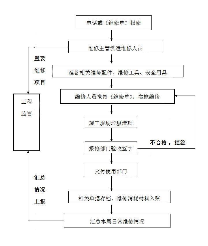 (2)对因技术和专业工种无法完成的维修项目,工程部及时反馈给报修部门,说明原因、预计维修时间。待联系好相关专业人员后,马上组织维修。