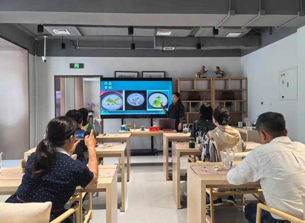 点茶是宋代最为兴盛的一种饮茶方式,也是中国古代茶艺的代表之一。活动现场,国家二级茶艺技师张菊通过一幅幅精美的点茶作品赏析,向老同志详细介绍了宋代点茶的历史背景和文化内涵,带领大家认识点茶器具“十二先生”、欣赏茶器之美,现场演示“七汤点茶法”的基本流程和操作方法。