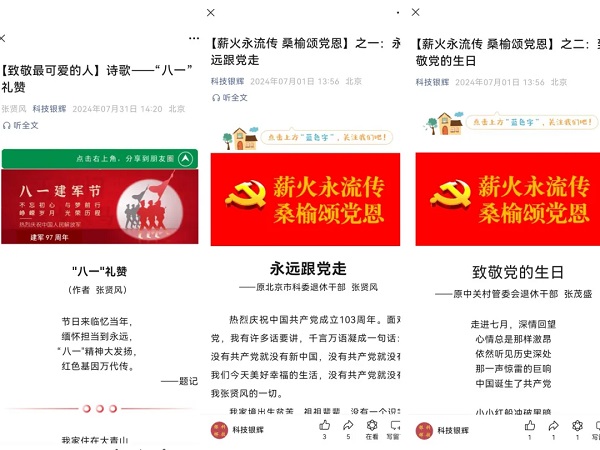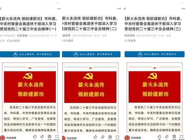 充分运用信息化手段,依托“科技银辉”公众号开设“薪火永流传·银龄建新功”专栏,集中展示老同志学习党的二十届三中全会精神的感言、笔记及摄影作品,定期发布读书感悟、自创文章、诗歌作品等,进一步丰富了网络书香文化,搭建起线上读书学习交流新平台。该公众号已经成为老同志展示自我、交流思想的窗口,还带动年轻干部阅读学习,形成了良好的代际传承氛围。