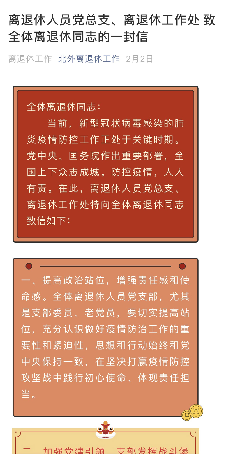 北京外国语大学离退休人员党支部发布致全体离退休同志的一封信
