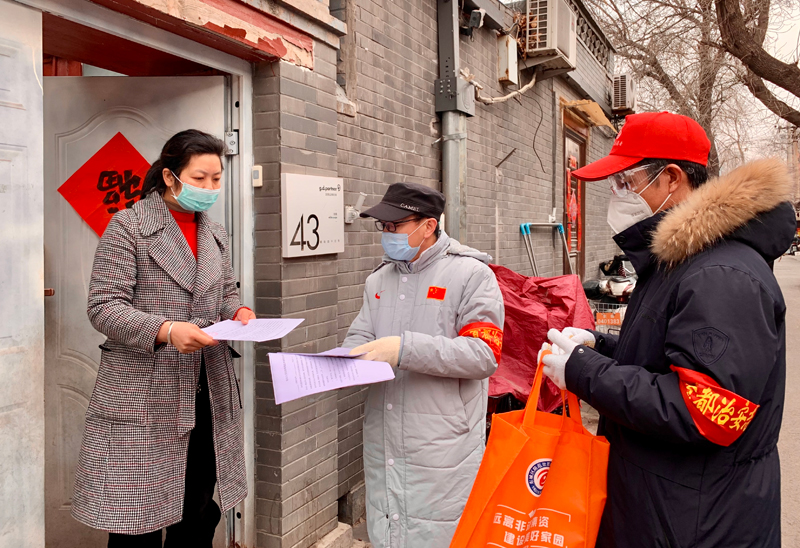 东城区委老干部局下沉干部万国勇和王立忠上门对离京返京人员进行登记,宣传居家隔离、每日测温等工作要求和疫情防控知识