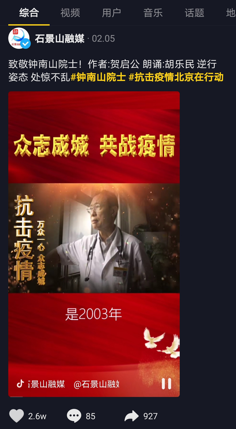 石景山区退休干部贺启公创作的《敬礼钟南山院士》在抖音平台发布,播放量近百万次