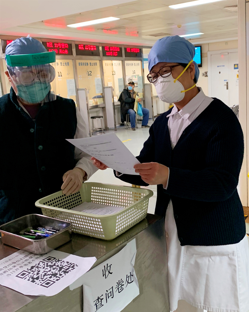 北大医院退休党员姚秀彬疫情期间坚守岗位,为门诊就诊患者反复讲解就诊流程,并做流行病学调查
