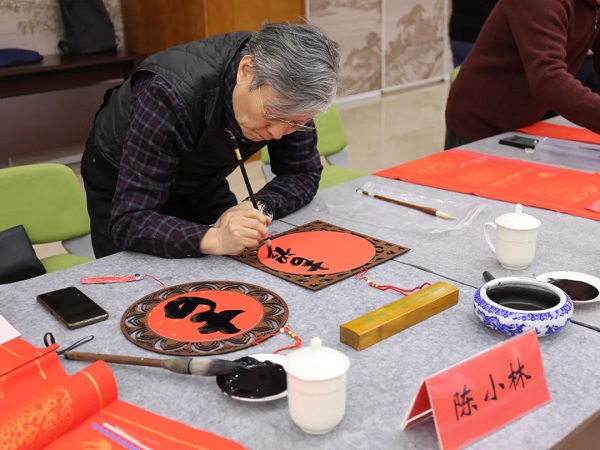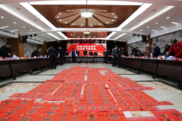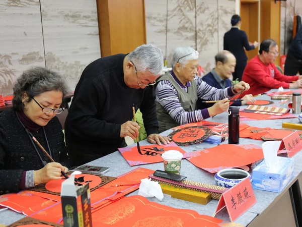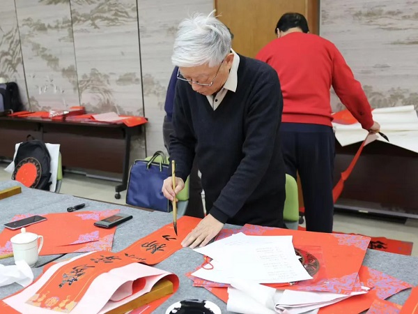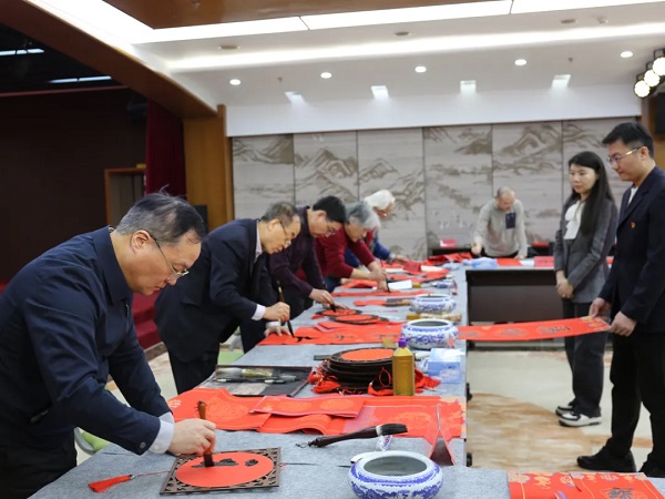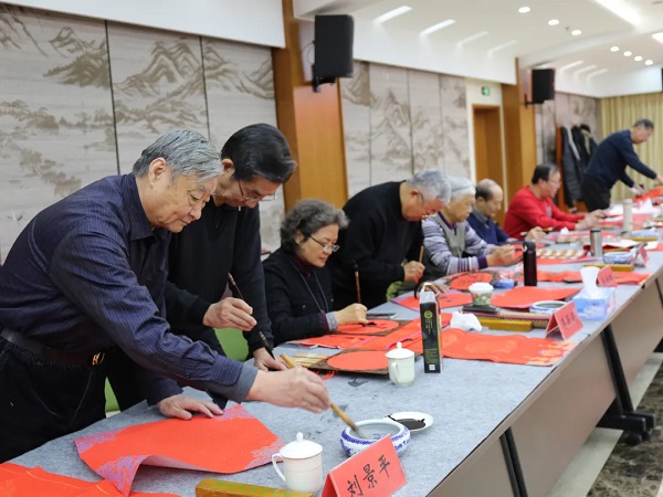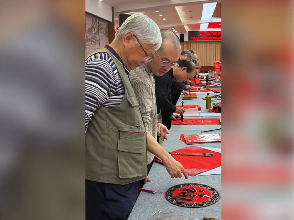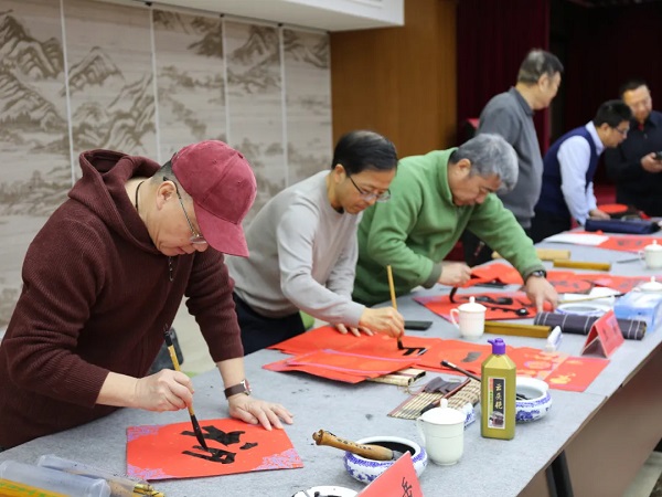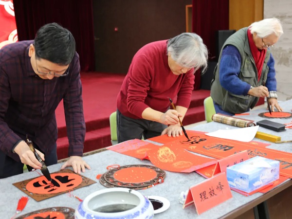 中央广播电视总台老年书画协会会长理效峰,中国美术家协会会员、中国书法家协会会员王燕民,中国电影美术家协会会员马德利,原中央电视台电视剧制作中心一级美术师蔡龙西,中央广播电视总台离退休干部局副局长边传久,市委老干部局副局长、北京老干部大学校长刘煦淳,北京老干部大学老师刘浩川率先开笔,随后总台老年书画协会6位艺术家、北京老干部大学书画班12位学员挥毫创作。笔会现场红纸铺展、墨香四溢、成果丰硕,书写福字挂牌300件,“福”“寿”大字千余个,春联、条幅等书画作品200余幅。一个个福字、一副副对联,行草楷隶各显神韵,饱含美好祝愿,增添浓浓年味,传递新春祝福,现场洋溢着欢乐祥和的文化迎春氛围。