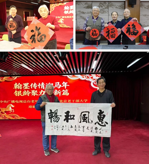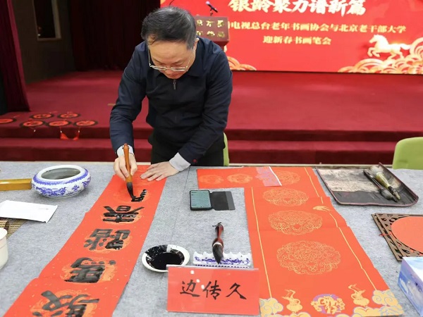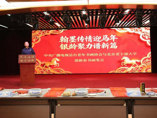 1月29日,为喜迎丙午马年新春佳节,搭建书画艺术交流平台,中央广播电视总台老年书画协会与北京老干部大学携手,在北京市老干部活动中心成功举办“翰墨传情迎马年 银龄聚力谱新篇”迎新春书画笔会。中央广播电视总台离退休干部局副局长边传久,市委老干部局副局长、北京老干部大学校长刘煦淳出席笔会活动并致辞,市老干部活动中心主任、北京老干部大学常务副校长郭旭主持活动。中央广播电视总台老年书画协会艺术家、北京老干部大学师生代表30余人参加活动。